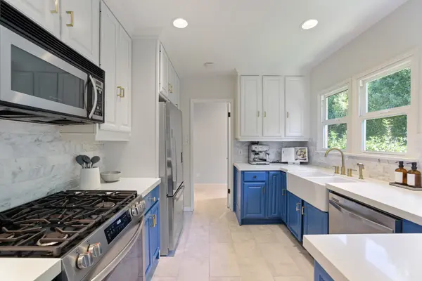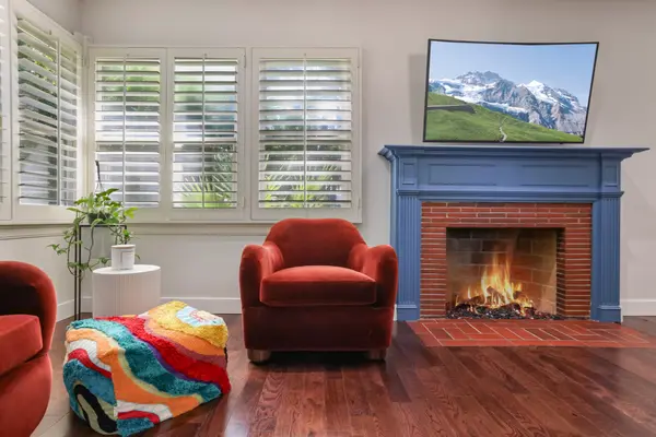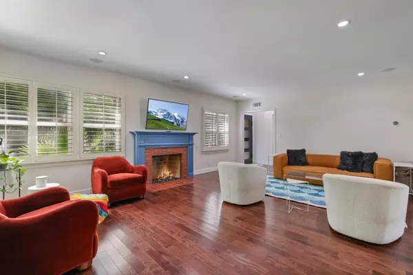 Inside, sunlight fills the open living area where hardwood floors and a custom fireplace create an inviting space for both everyday living and quiet evenings at home. The reimagined kitchen features sleek quartz countertops, a handcrafted Carrera marble backsplash, custom cabinetry, stainless steel appliances, and a farmhouse sink. Just off the kitchen, the formal dining area flows effortlessly outdoors to a private backyard retreat with a tiled patio, mature landscaping, and plenty of space for entertaining or unwinding.